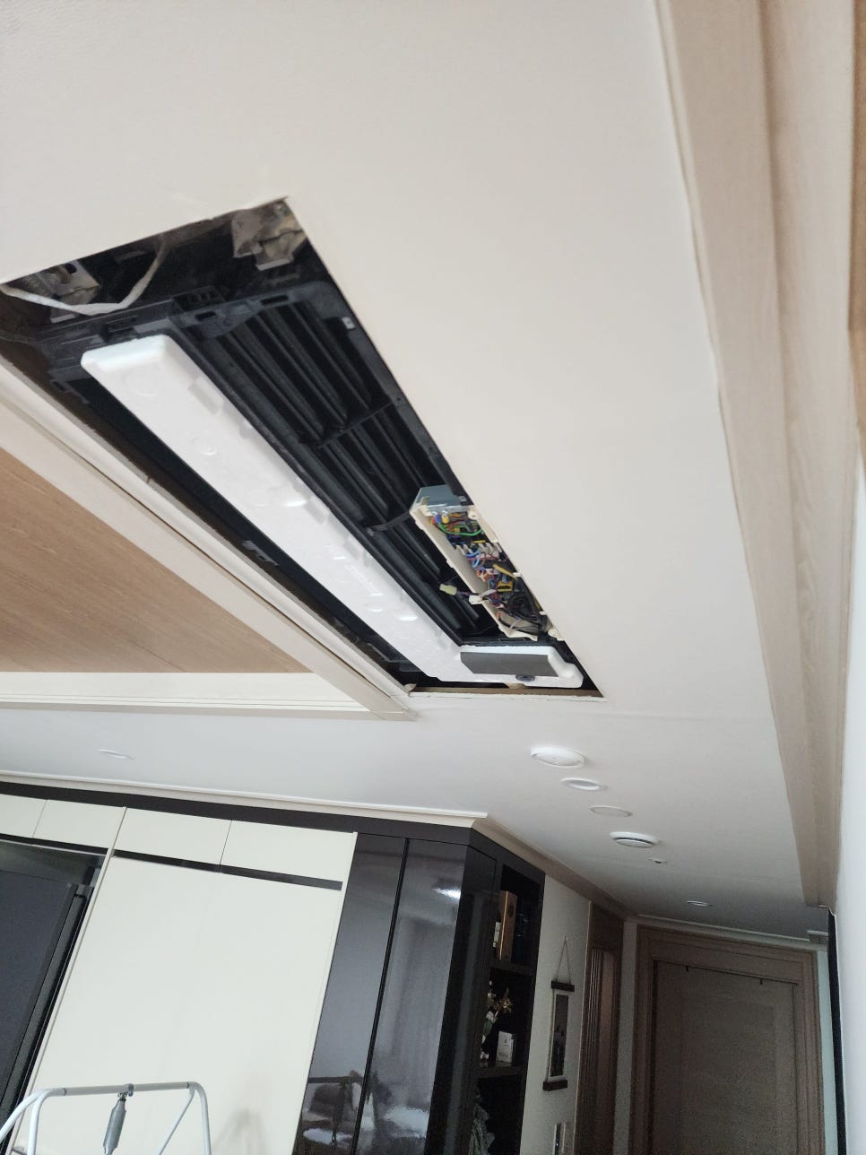 즉각적인 전원 차단 (가장 중요): 리모컨으로 에어컨을 끄는 것에 그치지 말고, 신발장이나 현관에 있는 '실외기 전용 차단기(두꺼비집)'를 완전히 내려주세요. 천장 속에 고인 물이 에어컨 기판이나 전선에 닿으면 합선으로 인한 대형 화재나 메인보드 소손(타버림)으로 이어질 수 있습니다.