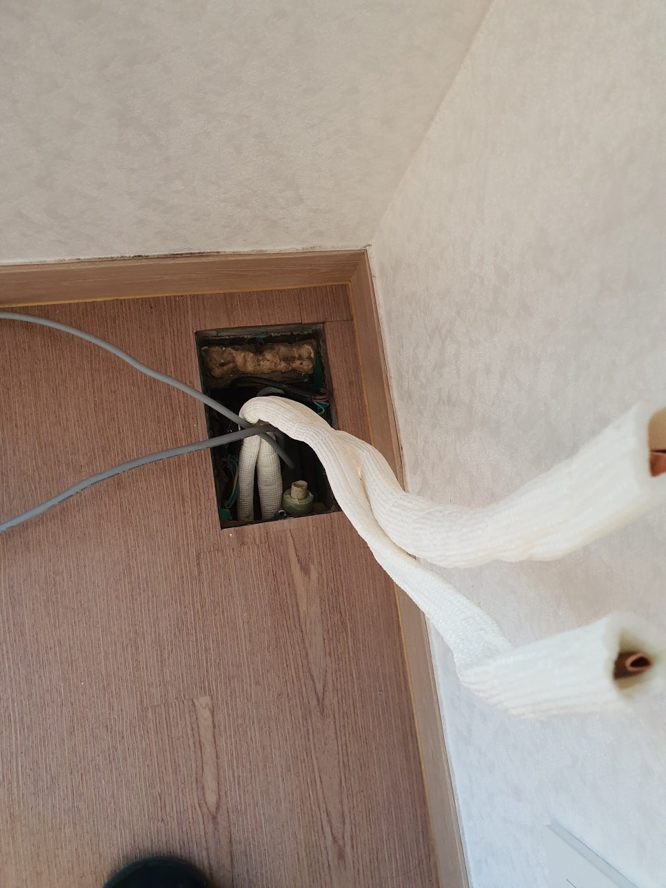 상가, 구축 빌라, 또는 아파트 저층부의 천장 속에는 종종 쥐 같은 설치류가 돌아다니며 에어컨 배관을 감싸고 있는 푹신한 보온재(단열재)나 얇은 플라스틱 호스를 갉아먹는 경우가 빈번하게 발생합니다. 또는 이사 전 인테리어 목공 공사나 타공 작업 중 작업자의 실수로 배관을 건드려 금이 가는 경우도 있습니다. 이렇게 물리적으로 구멍이 뻥 뚫린 배관은 즉각적인 절단 및 교체 시공이 유일한 정답입니다.