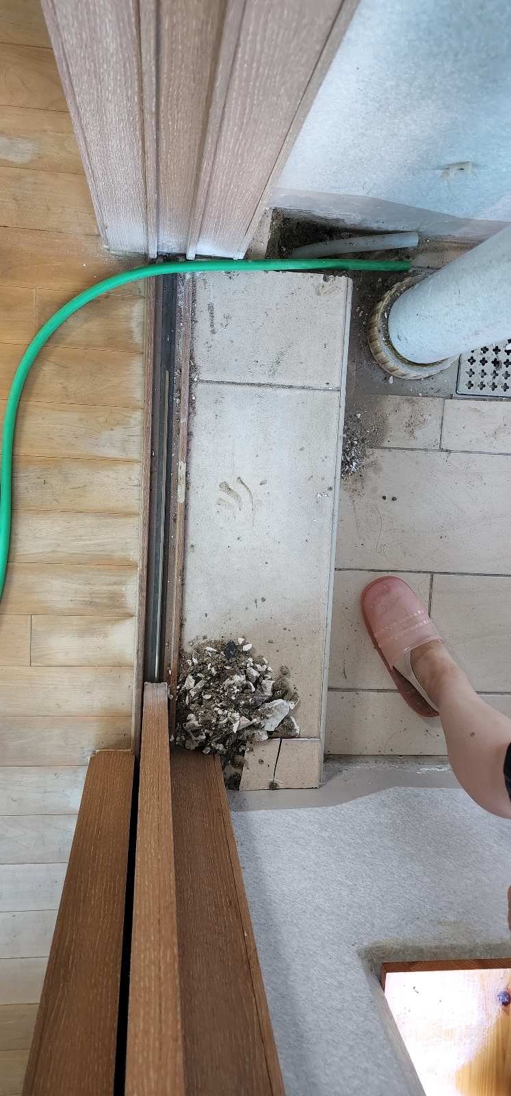 최근 리모델링을 했거나 신축 아파트에 입주했다면 이 원인일 확률이 높습니다. 공사 중 발생하는 시멘트 가루, 톱밥, 타일 가루 등이 배관 입구로 들어가 물과 만나면 배관 내부에서 돌처럼 굳어버립니다. 이는 일반적인 펌프질로는 절대 해결되지 않는 고난도 막힘입니다.