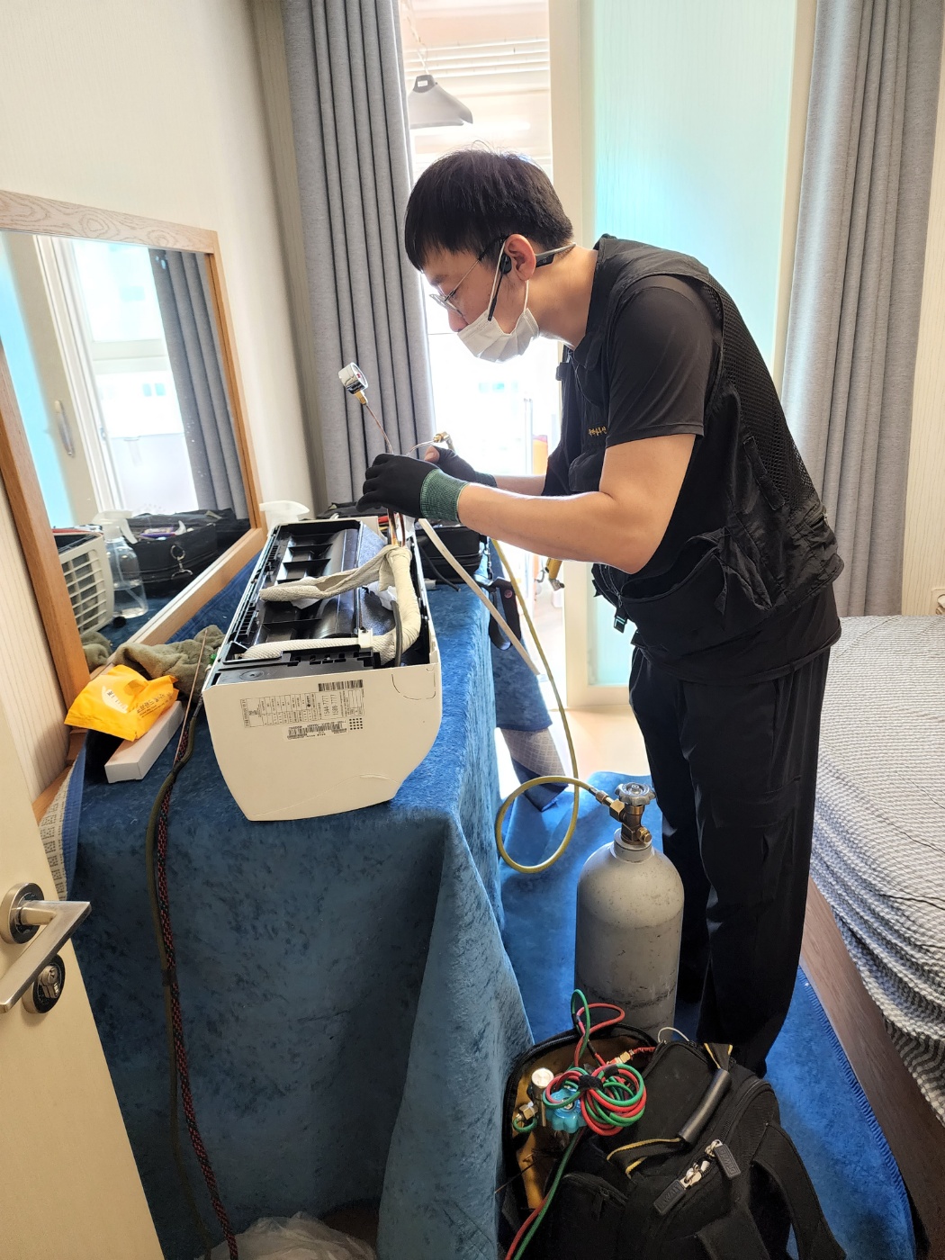 냉매 정량 충전: 저울을 이용해서 제조사 사양에 맞는 정확한 양의 냉매를 주입합니다. 제품의 냉방력을 최상으로 만들기 위해 필수적인 과정입니다 .